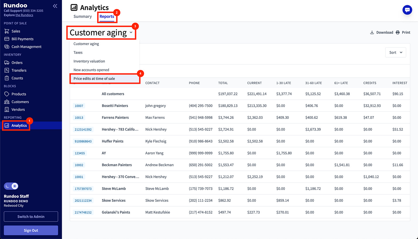 Go to Analytics > Reports. The default report is “Customer aging”, but if you click on the title, you can see other reports. Click “Price edits at time of sale.”