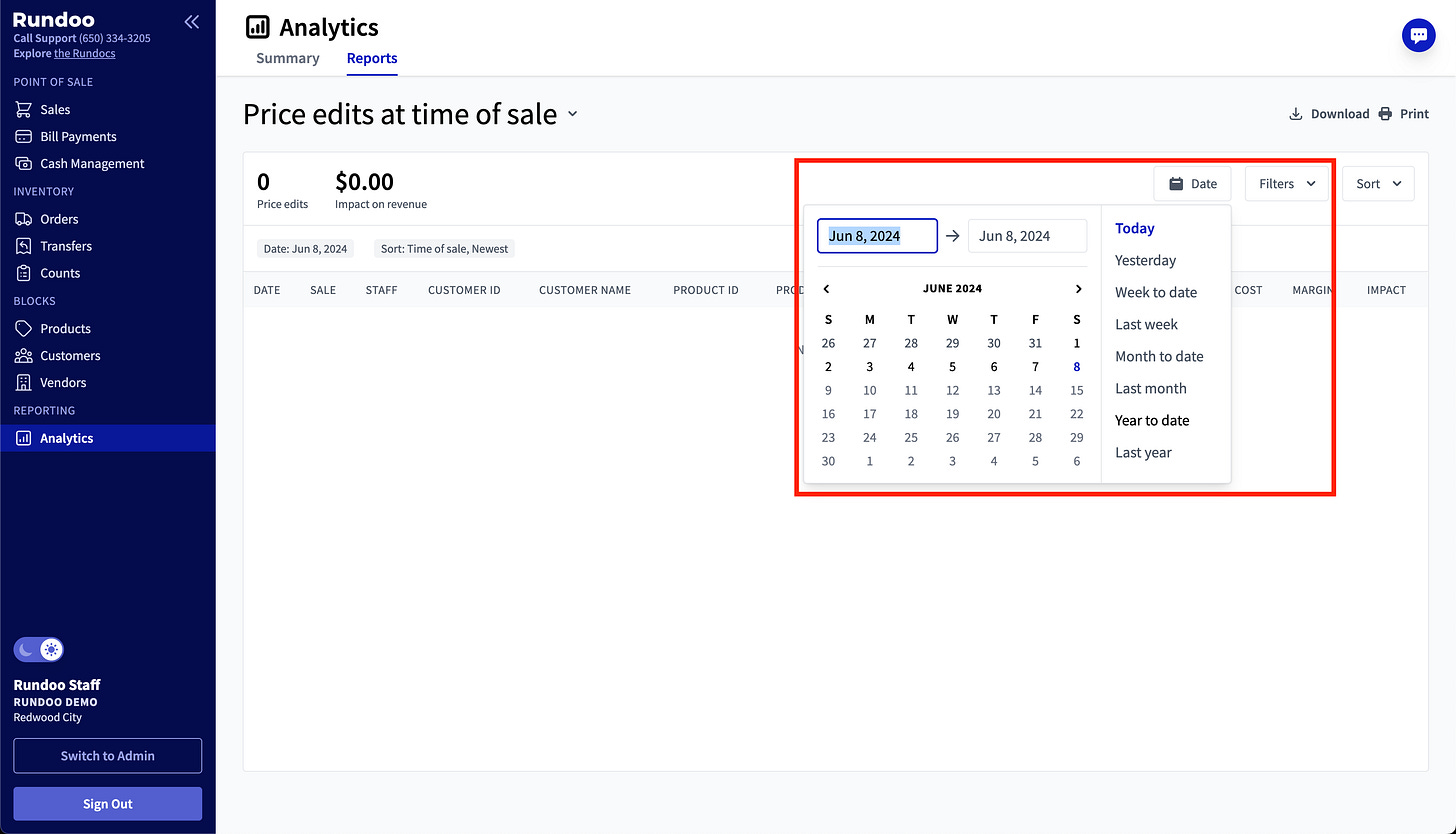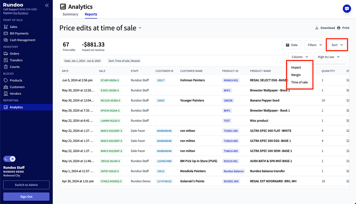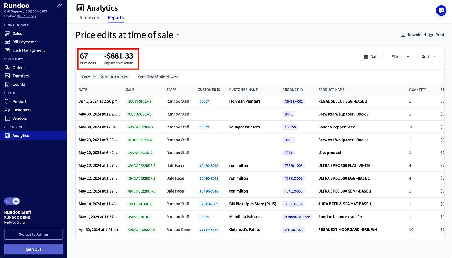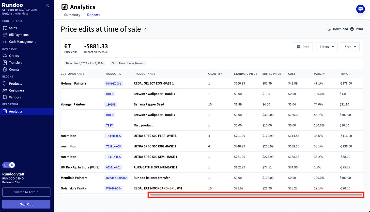 Once the data loads, you can see the total impact on the business. For example, below we’ve had 67 price edits with an $881.33 impact on revenue year-to-date.